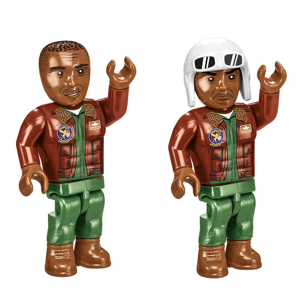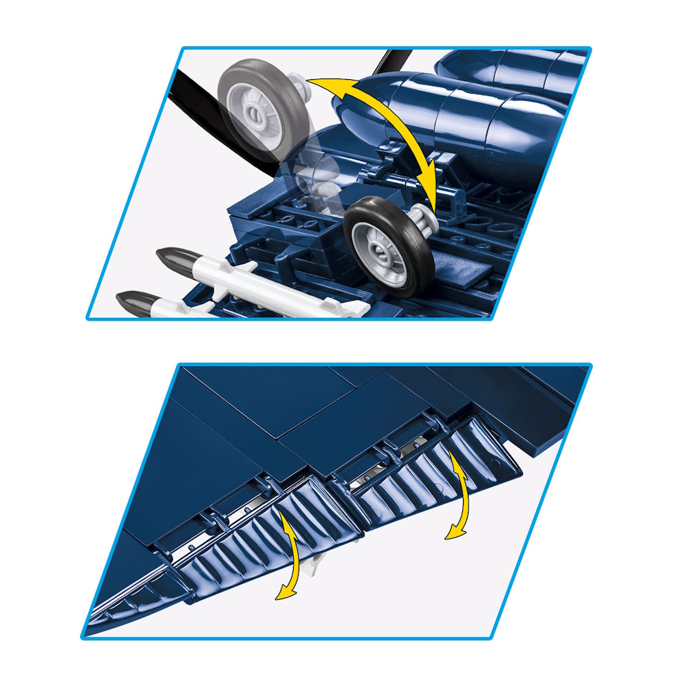 The Cobi F4U-4 Corsair contains 520 high quality blocks, with prints (no stickers), and a minifig with 2 interchangeable heads. The moving parts include the cabin, ailerons, a propeller, and folding wheels. It comes with a stand and a display plate with the name of the aircraft model printed on it.