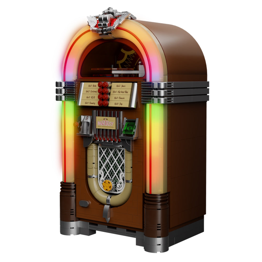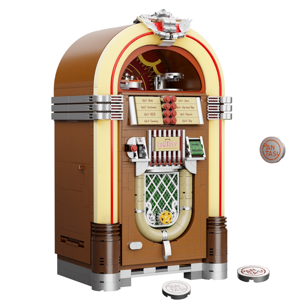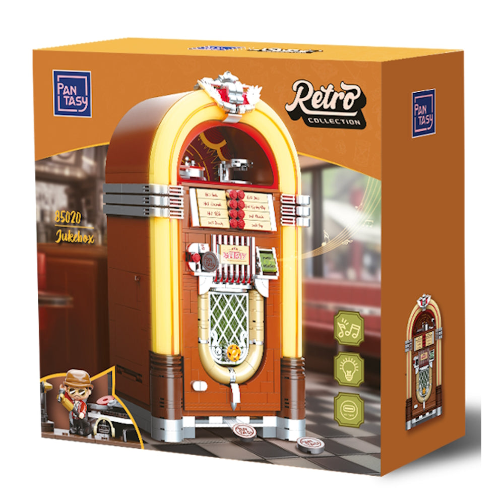 Step back into mid‑century Americana with the Pantasy Retro Jukebox (85020). This nostalgic set recreates the iconic arched shape of a vintage diner jukebox in stunning detail, featuring printed chrome accents, ambient lights, and a press‑type sound module that plays ~20‑second tunes from Jazz, Rock, and Classical tracks when you drop in a coin token.