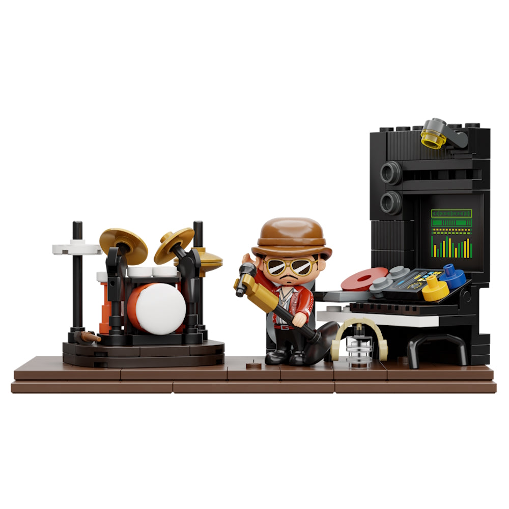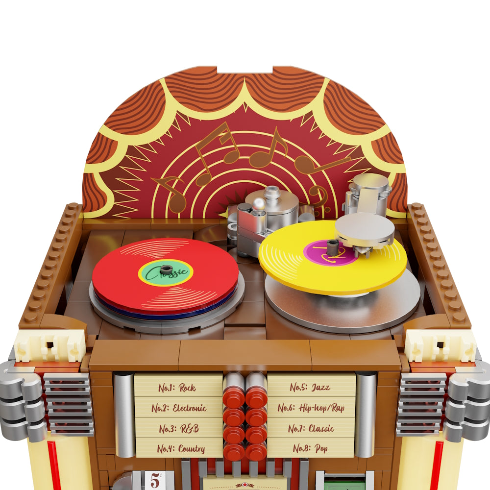 Inside, a transparent back reveals a dual‑level mini performance studio with mechanical record changer, tube amplifier, and light elements. Crafted from premium ABS bricks and acrylic discs, the model measures approximately 18 × 14 × 32 cm and includes a themed minifigure, three coin tokens, and four colored acrylic records.
