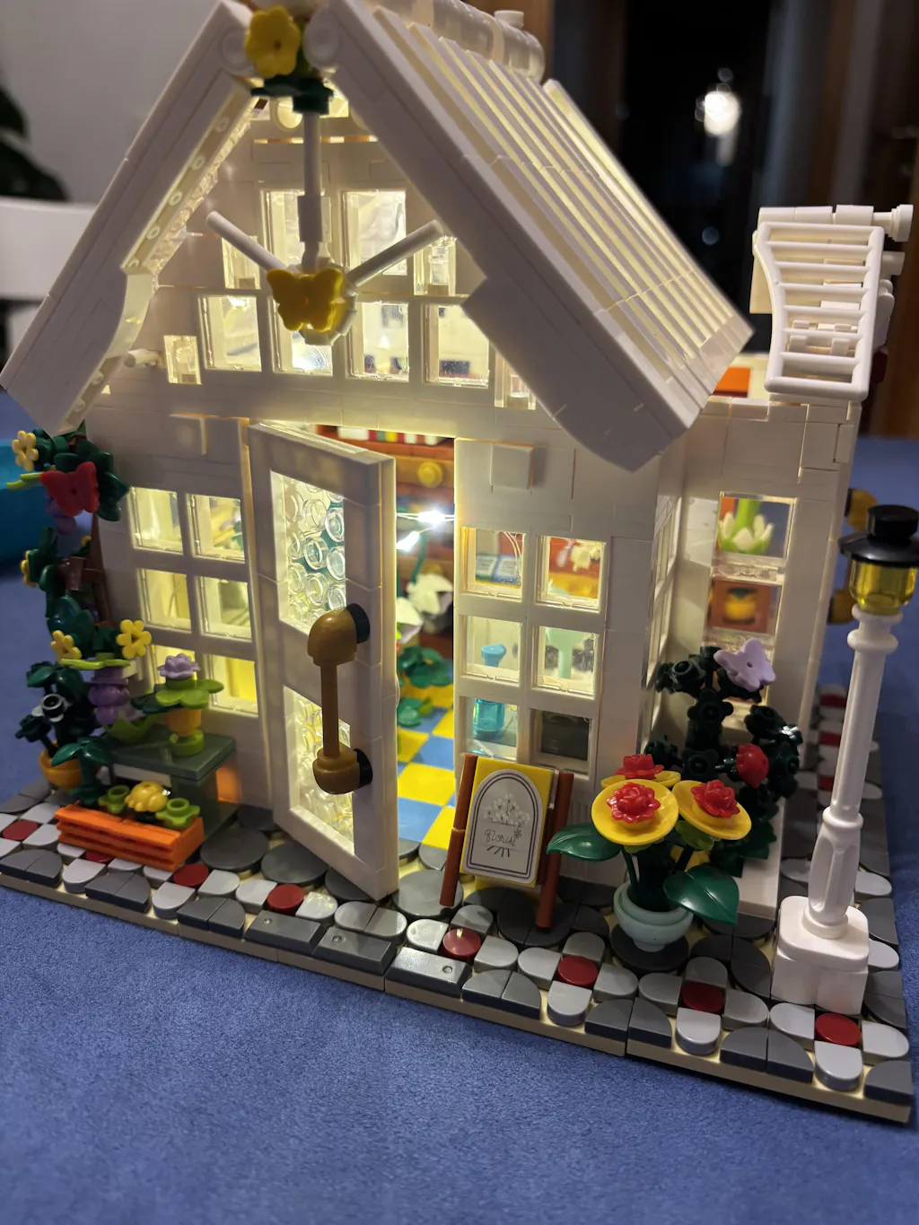 The 1593-piece set features lots of flowers in a cozy space. The back wall houses a hinge that allows the set to fully open, revealing the interior.