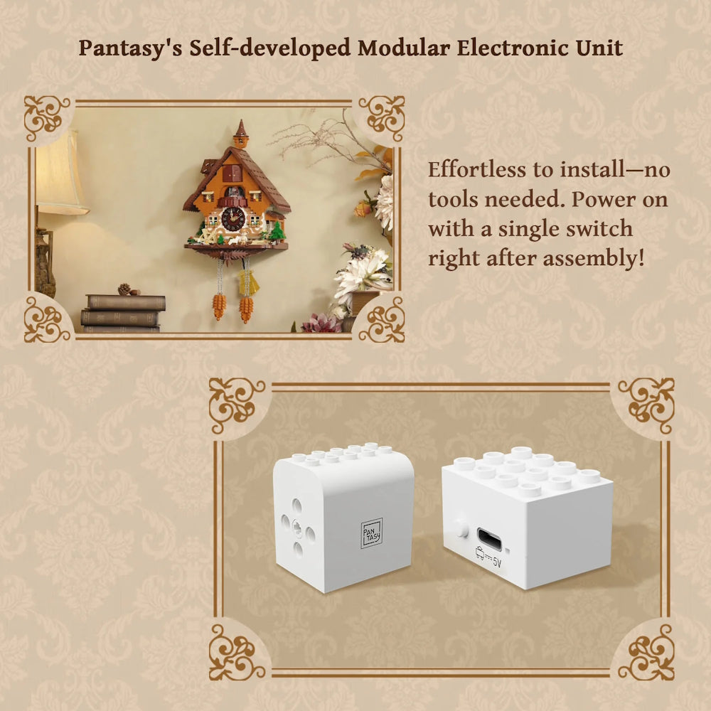 Redescubre la nostalgia con el Reloj de cuco de Pantasy, inspirado en los relojes cucú europeos de estilo chalet, con un jardín que incorpora una rueda hidráulica funcional, un cuco que sale a saludar y unos péndulos que se mueven.