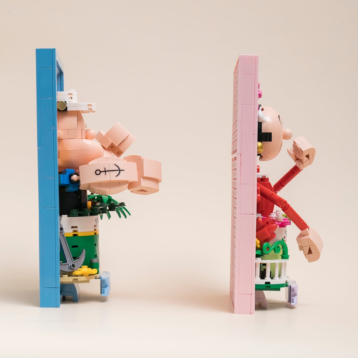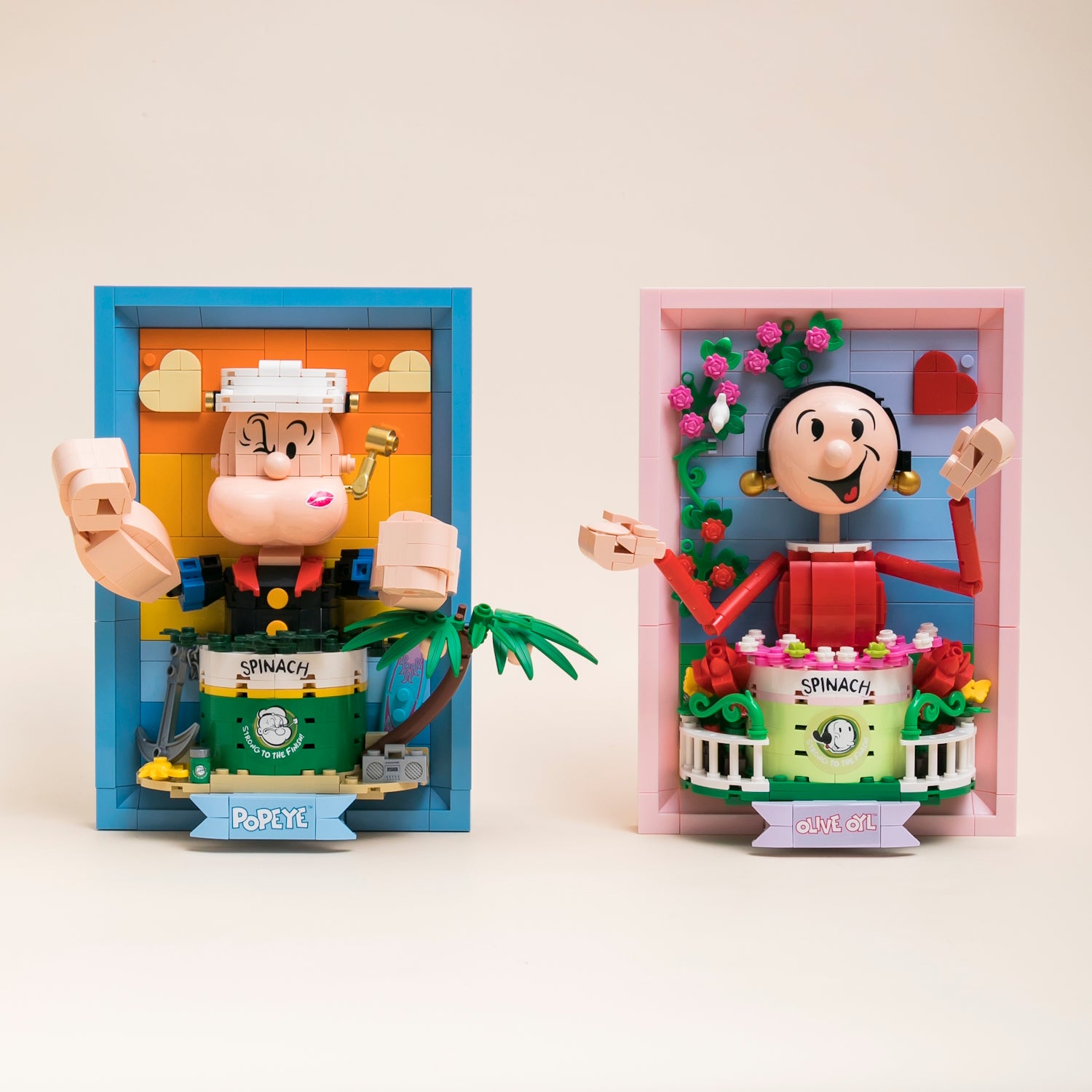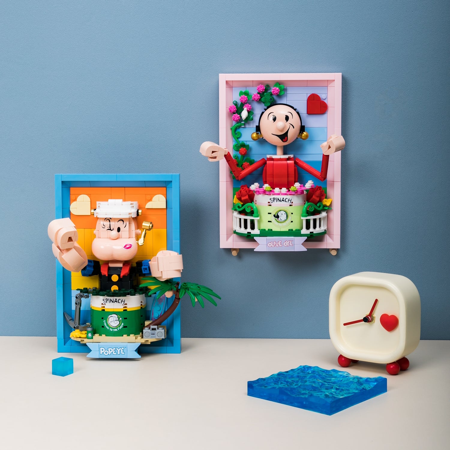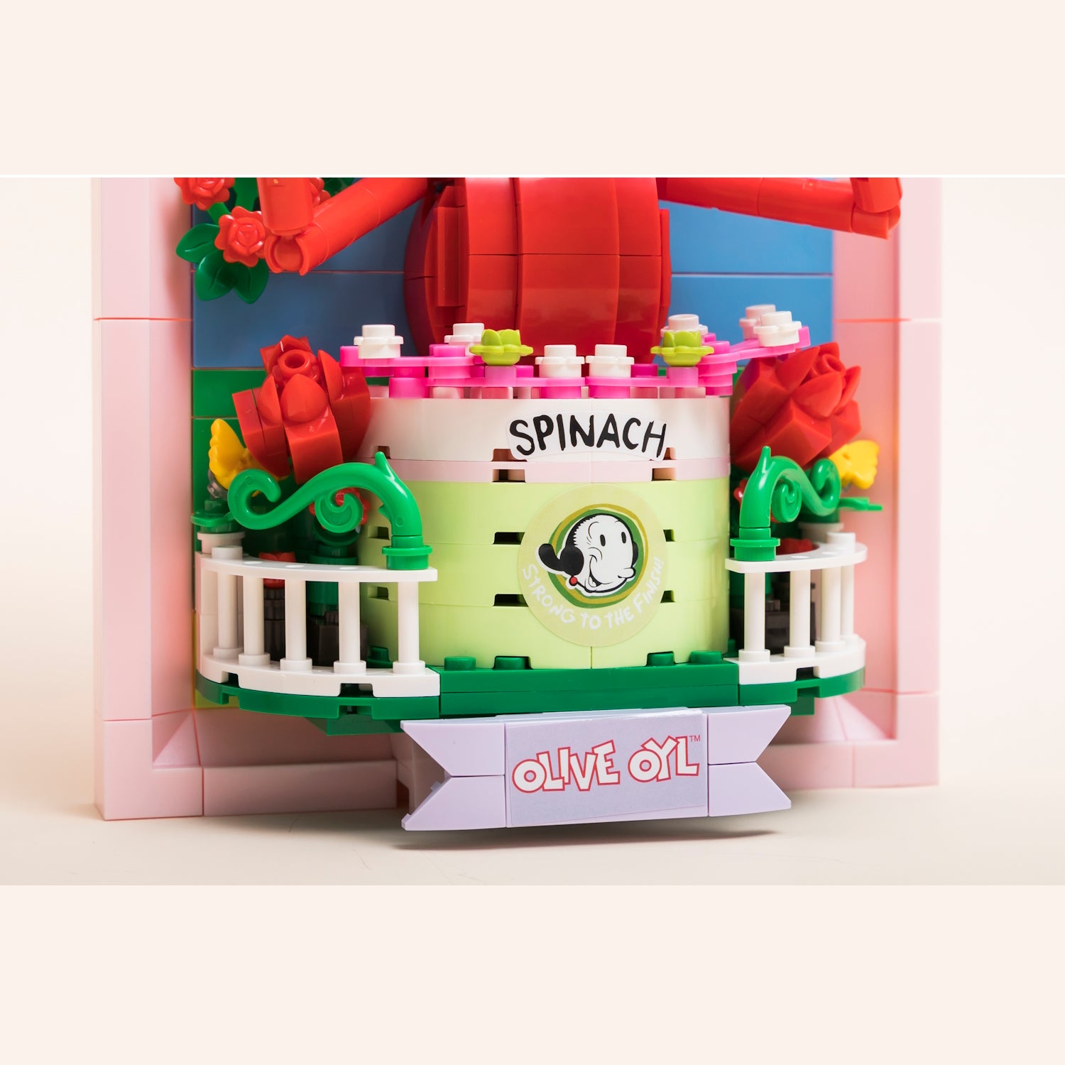 Este set de construcción de Pantasy, de la colección Popeye, es una divertida imagen en 3D de la alegre Olivia que sale de una lata de espinacas en un balcón florido.