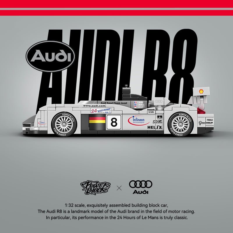 Llévate a casa una leyenda de las carreras de resistencia con el Audi R8 Le Mans (escala 1:32), dentro de la serie Power Block de la marca Power Build. Este set con licencia oficial reproduce las líneas elegantes y el espíritu competitivo del icónico coche de Audi, en el formato de coches de 8 studs al estilo Speed Champions.